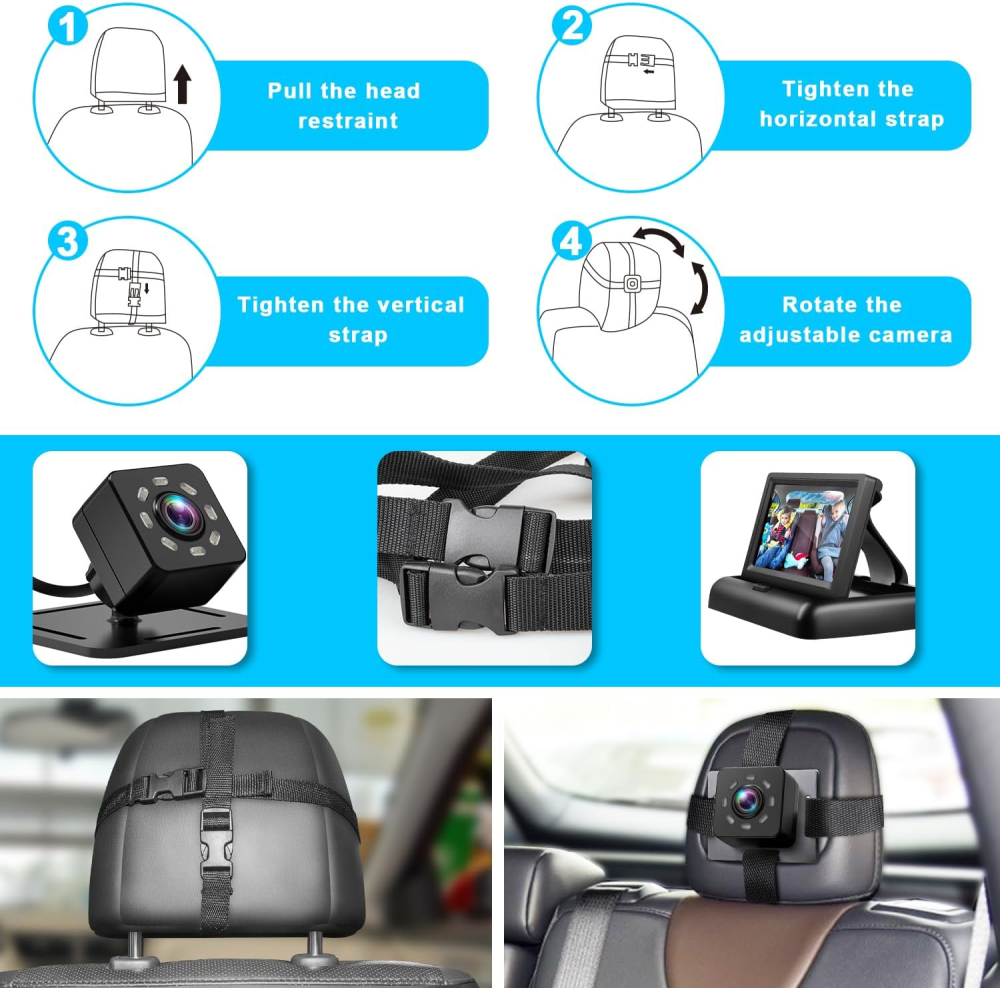 - شاشة HD واضحة بحجم 4.3 إنش توفر رؤية كاملة لمقعد الطفل أثناء القيادة